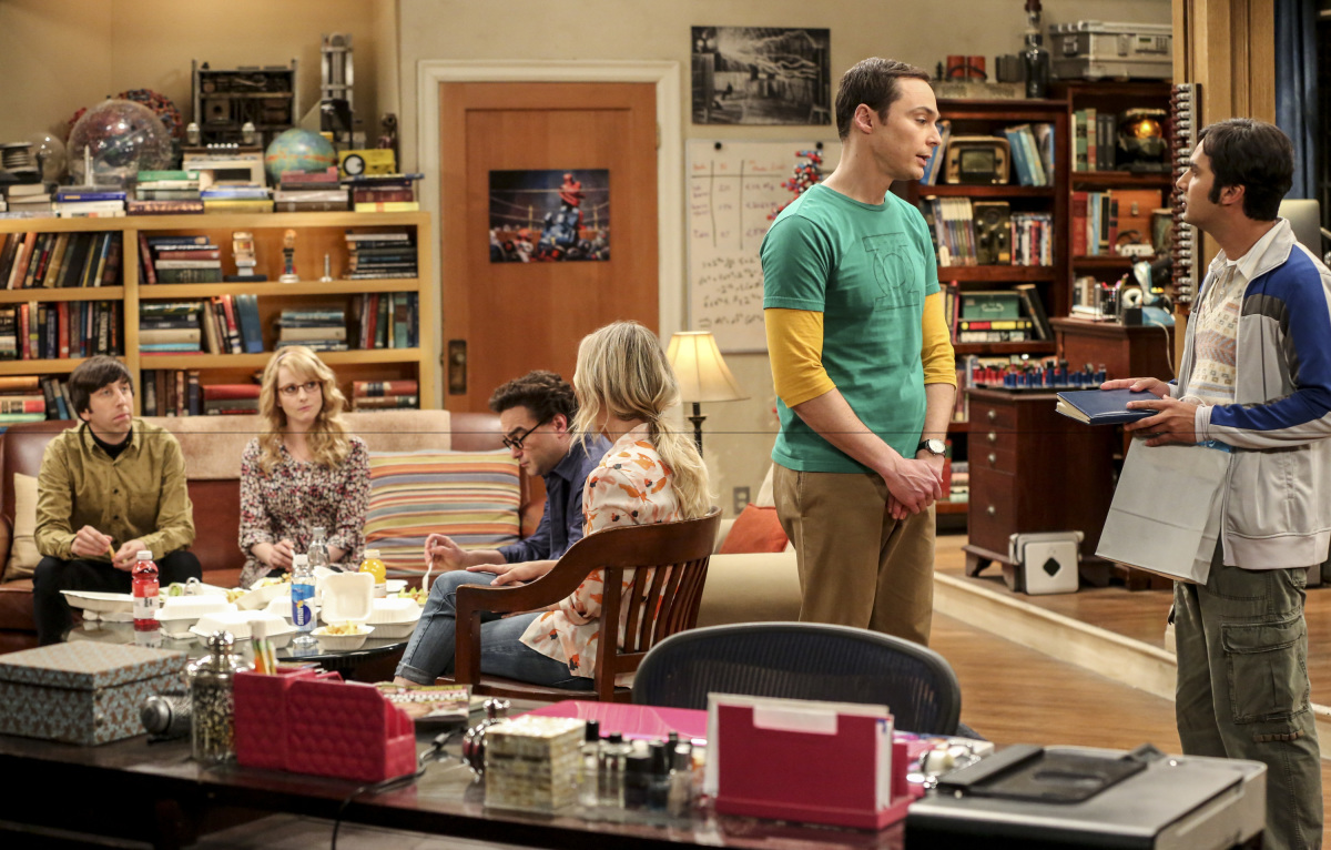 "The Escape Hatch Identification" -- Pictured: Howard Wolowitz (Simon Helberg), Bernadette (Melissa Rauch), Leonard Hofstadter (Johnny Galecki), Penny (Kaley Cuoco), Sheldon Cooper (Jim Parsons) and Rajesh Koothrappali (Kunal Nayyar). When Raj moves out of his apartment, Leonard and Penny offer him Sheldon's old room, on THE BIG BANG THEORY, Thursday, March 9 (8:00-8:31 PM, ET/PT) on the CBS Television Network. Christine Baranski returns as Sheldon's mother, Beverly. Photo: Michael Yarish/Warner Bros. Entertainment Inc. é 2017 WBEI. All rights reserved.